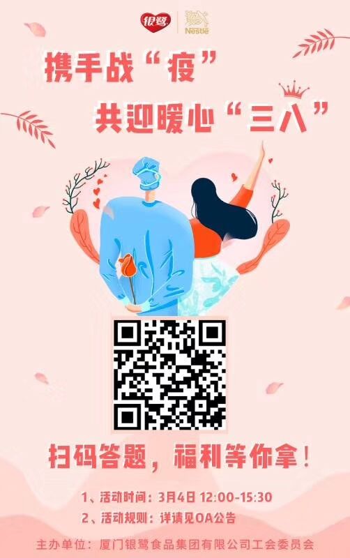 為慶祝節日的到來,銀鷺食品集團工會委員會,人力資源中心圍繞“攜手戰“疫” 共迎暖心三八“這一主題,開展系列活動,活動由廈門銀鷺與雀巢大中華區活動有機結合,為女性員工們送上特別的祝福與問候。