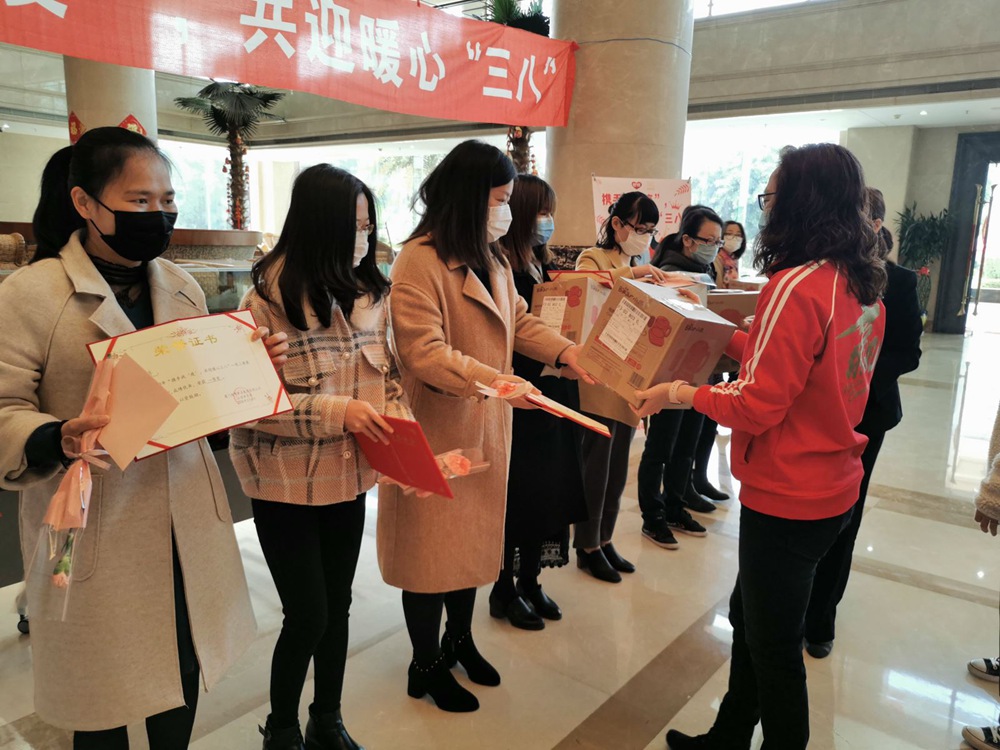 隨后總裁兼CEO孫亦農先生、首席財務官裴紅蘭女士、首席營銷官紀偉如女士、內審中心副總、銀鷺食品黨支部書記林麗霜女士為獲得一等獎的職工們送上鮮花、禮品。儀式簡單而溫馨,雖然大家都戴著口罩,但口罩擋不住她們的美麗,面對疫情,我們云擁抱、云互動,祝福是遠程的,心卻是如此貼近,這個3.8節過得比往年更有意義。