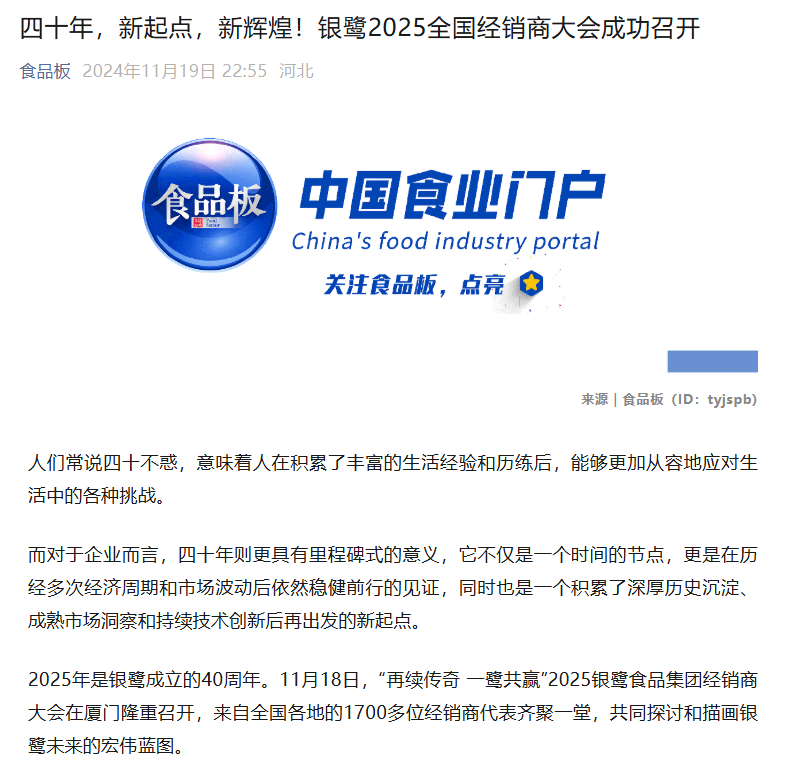 四十年,新起點,新輝煌!銀鷺2025全國經銷商大會成功召開(來源:食品板)發布日期:2024-11-26